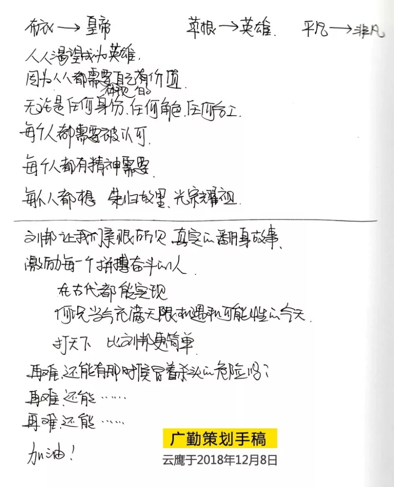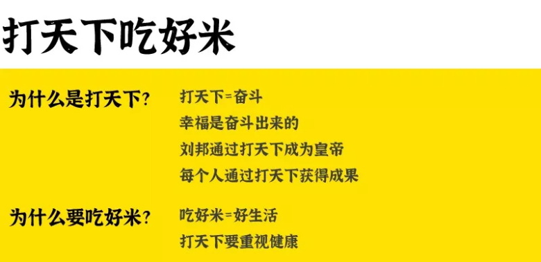 為了更深入的了解沛縣和劉邦的故事,奇思策劃小組查閱了沛縣的各種資料,看了兩部幾十集關(guān)于劉邦的電視劇,并結(jié)合沛縣人喝酒和做事都非常豪爽拼命的文化,奇思對(duì)廣勤策劃的目標(biāo)是能通過(guò)簡(jiǎn)煉的話語(yǔ),震憾心靈又容易記憶的呈現(xiàn),倡導(dǎo)一種精神和價(jià)值觀,那就是