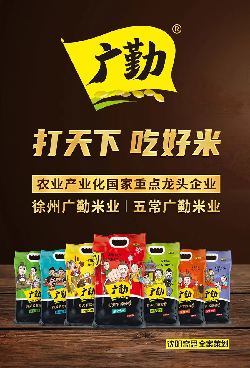 徐州廣勤米業(yè)是國家重點(diǎn)龍頭企業(yè),是沈陽奇思連續(xù)5年的戰(zhàn)略合作伙伴,奇思為廣勤全面打造品牌形象、產(chǎn)品包裝、企業(yè)文化、企業(yè)廠區(qū)、終端物料等,建立并積累起廣勤的品牌資產(chǎn),助力廣勤銷量翻倍,突破10萬噸,現(xiàn)已成為江蘇好米的一面旗幟。